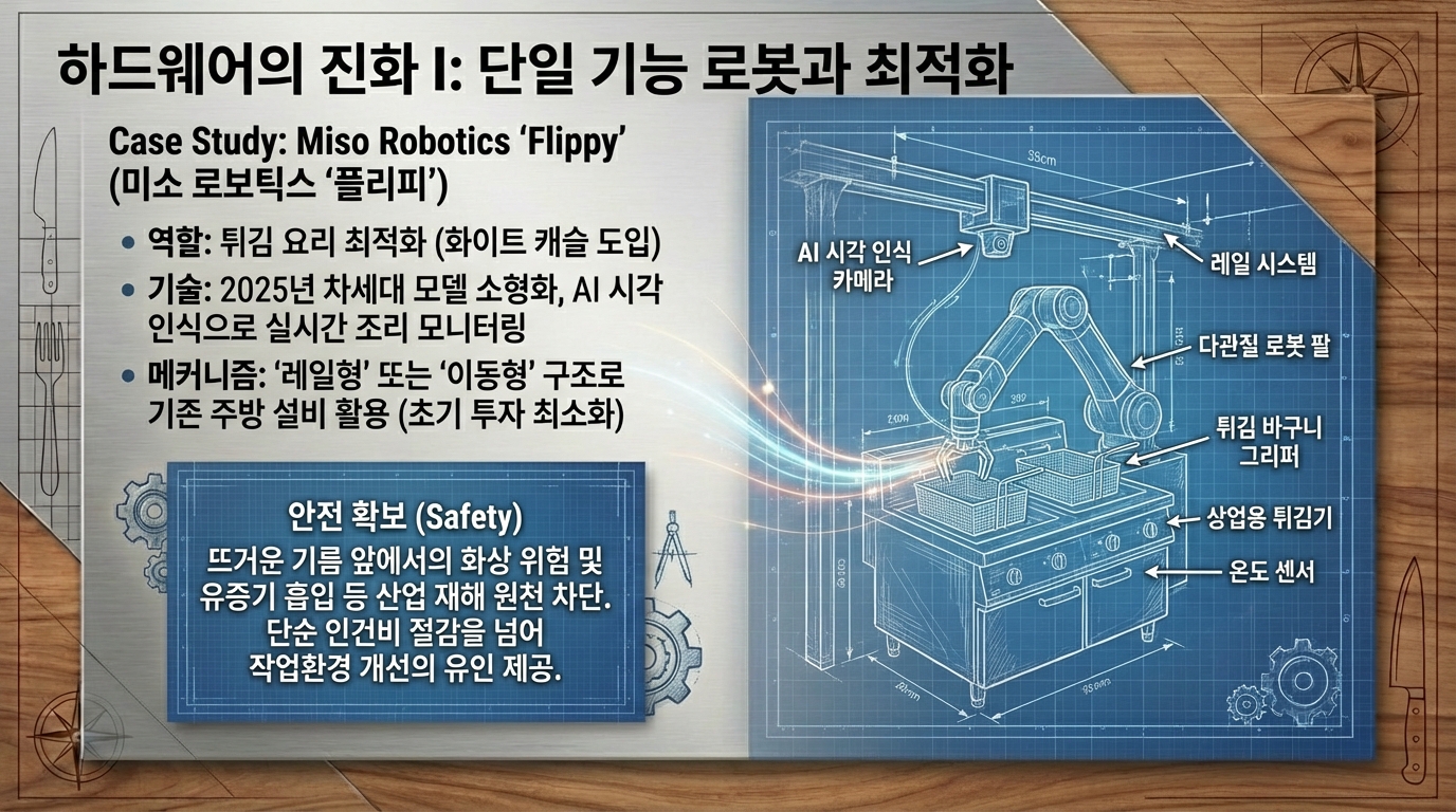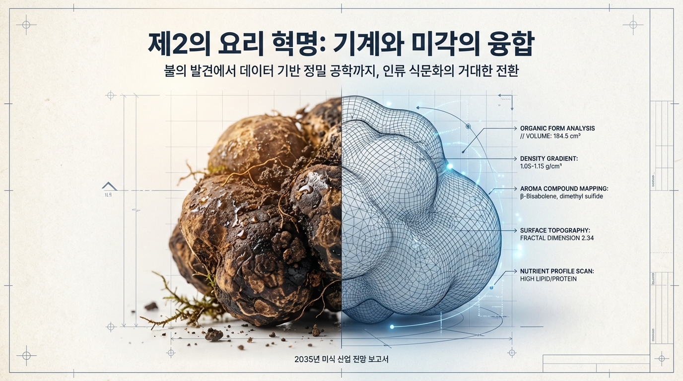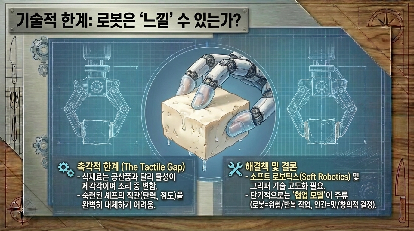 인류 문명사에서 불의 발견이 식재료를 익혀 먹게 함으로써 뇌 용량을 비약적으로 증대시키고 사회적 유대를 강화하는 첫 번째 요리 혁명을 일으켰다면, 21세기에 우리가 목격하고 있는 인공지능과 로보틱스의 결합은 요리라는 행위의 본질을 데이터와 정밀 공학의 영역으로 확장시키는 제2의 혁명이라 칭할 만하다. 요리는 단순히 생존을 위한 영양 섭취의 수단을 넘어 문화적 정체성을 형성하고 인간관계의 매개체 역할을 수행해 왔으나, 이제 그 물리적, 관념적 공간인 주방은 실리콘 밸리의 알고리즘과 첨단 로봇 공학이 교차하는 실험실로 변모하고 있다. 우리는 현재 노동 집약적이었던 요리 과정이 데이터 기반의 정밀 공학으로 전환되는 역사적 변곡점에 서 있으며, 과거의 산업 혁명이 공장의 풍경을 바꾸었듯 현재 진행 중인 4차 산업 혁명은 우리의 식탁과 레스토랑, 그리고 농업 현장까지 이어지는 푸드 시스템 전반을 송두리째 혁신하고 있다. 본 보고서는 이러한 변화의 양상을 기술적, 경제적, 문화적 관점에서 심층적으로 분석하고, 2035년 이후 도래할 새로운 미식의 시대를 조망하고자 한다. 특히 단순한 자동화를 넘어선 '계산적 미식'의 부상과, 이것이 인간의 고유한 영역이라 여겨졌던 창의성과 감각의 영역을 어떻게 침투하고 보완하는지를 면밀히 고찰할 것이다. 현재의 기술적 진보는 단순히 인간의 노동을 대체하는 수준에 머무르지 않고 있다. 센서 기술의 발달은 인간의 미각과 후각을 데이터화하고 있으며, 딥러닝 알고리즘은 수천 년간 축적된 레시피 데이터를 분석하여 인간이 상상하지 못한 맛의 조합을 창조해내고 있다. 소니 AI의 가스트로노미 플래그십 프로젝트나 삼성의 삼성 푸드 비전은 요리가 더 이상 직관과 경험에만 의존하는 예술이 아니라, 고도의 데이터 과학과 정밀 로봇 공학이 결합된 종합 과학으로 진화하고 있음을 보여준다. 이러한 변화는 필연적으로 전통적인 '요리사'의 정의를 흔들고, '손맛'이라는 모호한 개념을 정량화 가능한 알고리즘으로 치환하려는 시도를 동반한다. 경제적 관점에서 볼 때, 이러한 자동화의 가속화는 전 세계적인 노동력 부족 현상과 인건비 상승이라는 구조적 문제에 대한 필연적인 대응이다. 캘리포니아의 패스트푸드 노동자 최저임금 인상과 같은 정책적 변화와 코로나19 팬데믹이 촉발한 비대면 서비스의 확산은 외식 산업에서 로봇 도입을 선택이 아닌 생존의 문제로 만들었다. 미소 로보틱스의 플리피와 같은 조리 로봇이 패스트푸드 체인에 도입되는 현상은 이러한 거대한 흐름의 서막에 불과하다. 더 나아가, 주방이 없는 식당인 '고스트 키친'의 확산은 음식의 생산과 소비 공간을 물리적으로 분리시키며, 도시의 쿨리너리 인프라 자체를 재편하고 있다. 요리 로봇 시장은 현재 폭발적인 성장세를 보이고 있다. 2020년대 초반이 실험적인 프로토타입과 제한적인 상업용 도입의 시기였다면, 2025년을 기점으로 본격적인 확산기에 접어들 것으로 전망된다. 루트 애널리시스의 보고서에 따르면, 요리 로봇 시장 규모는 2025년 약 40억 1천만 달러에서 2035년에는 123억 7천만 달러로 급성장할 것으로 예상되며, 이 기간 동안 연평균 성장률은 약 11.92%에 달할 것으로 보인다. 다른 시장 조사 기관인 마켓 리서치 퓨처는 더욱 낙관적인 전망을 내놓았는데, 2035년까지 연평균 15.12%의 성장률을 기록하며 시장 규모가 약 119억 9천만 달러에 이를 것으로 예측했다. 이러한 성장은 단순히 양적인 팽창을 넘어, 로봇의 형태와 기능이 고도로 전문화되고 다양화되는 질적인 변화를 수반한다. 현재 상용화되고 있는 요리 로봇의 형태는 크게 단일 기능 로봇과 다기능 로봇으로 구분된다. 단일 기능 로봇의 대표적인 사례는 미소 로보틱스의 '플리피'이다. 패스트푸드 체인인 화이트 캐슬 등에서 도입하여 사용 중인 플리피는 튀김 요리라는 특정 작업에 최적화되어 있다. 2025년 출시 예정인 차세대 플리피 모델은 더욱 소형화되고 설치가 용이해졌으며, AI 기반의 시각 인식 기술을 통해 식재료의 조리 상태를 실시간으로 모니터링한다. 이러한 로봇들은 기존 주방의 설비를 그대로 활용할 수 있는 '레일형' 또는 '이동형' 구조를 채택함으로써, 막대한 초기 인프라 투자 없이도 자동화를 가능하게 한다는 점에서 상업적 매력도가 높다. 로봇이 기존의 튀김기 위에 설치된 레일을 따라 이동하며 바스켓을 조작하는 방식은 공간 효율성을 극대화하며, 인간 작업자가 뜨거운 기름 앞에서 겪을 수 있는 화상 위험이나 유증기 흡입과 같은 산업 재해를 원천적으로 차단한다. 이는 로봇 도입이 단순히 인건비 절감을 넘어 작업 환경 개선과 안전 확보라는 측면에서도 강력한 유인을 제공함을 시사한다. 반면, 다기능 로봇은 인간 셰프의 동작을 모방하여 복잡한 요리 과정을 수행하는 것을 목표로 한다. 몰리 로보틱스가 개발한 로봇 키친은 천장에 설치된 두 개의 로봇 팔이 셰프의 미세한 손동작까지 재현하며 재료 준비부터 조리, 플레이팅, 그리고 뒷정리까지 수행한다. 이 시스템은 3D 카메라와 센서를 통해 식재료의 위치와 상태를 파악하고, 수천 개의 레시피를 오차 