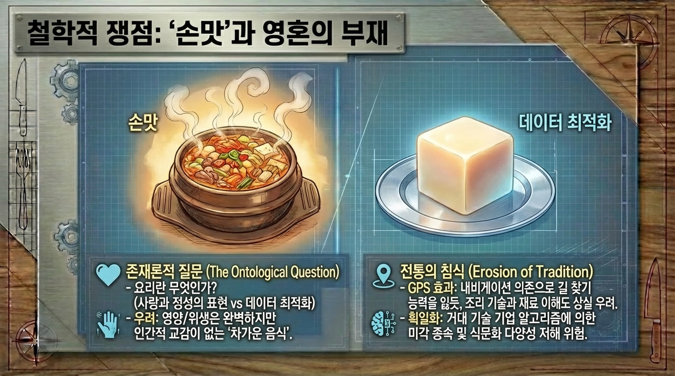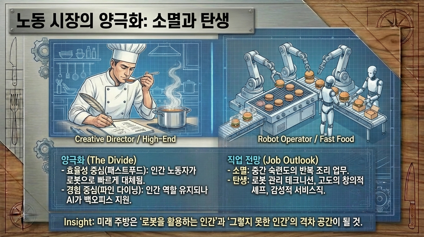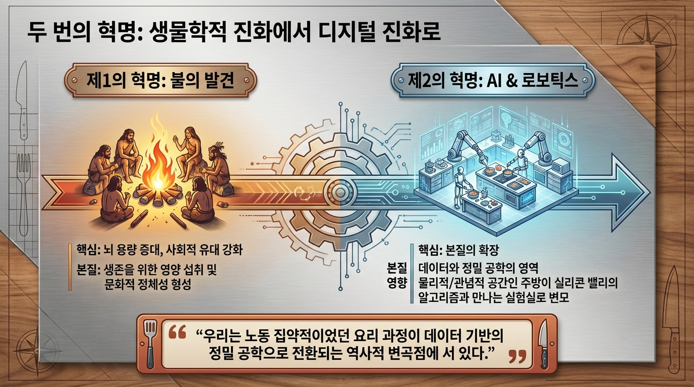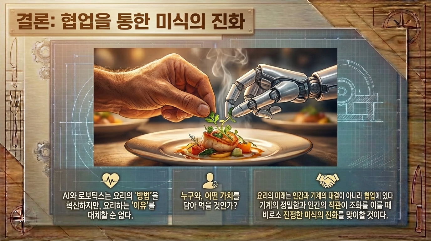인류 문명사에서 불의 발견이 식재료를 익혀 먹게 함으로써 뇌 용량을 비약적으로 증대시키고 사회적 유대를 강화하는 첫 번째 요리 혁명을 일으켰다면, 21세기에 우리가 목격하고 있는 인공지능과 로보틱스의 결합은 요리라는 행위의 본질을 데이터와 정밀 공학의 영역으로 확장시키는 제2의 혁명이라 칭할 만하다. 요리는 단순히 생존을 위한 영양 섭취의 수단을 넘어 문화적 정체성을 형성하고 인간관계의 매개체 역할을 수행해 왔으나, 이제 그 물리적, 관념적 공간인 주방은 실리콘 밸리의 알고리즘과 첨단 로봇 공학이 교차하는 실험실로 변모하고 있다. 우리는 현재 노동 집약적이었던 요리 과정이 데이터 기반의 정밀 공학으로 전환되는 역사적 변곡점에 서 있으며, 과거의 산업 혁명이 공장의 풍경을 바꾸었듯 현재 진행 중인 4차 산업 혁명은 우리의 식탁과 레스토랑, 그리고 농업 현장까지 이어지는 푸드 시스템 전반을 송두리째 혁신하고 있다. 본 보고서는 이러한 변화의 양상을 기술적, 경제적, 문화적 관점에서 심층적으로 분석하고, 2035년 이후 도래할 새로운 미식의 시대를 조망하고자 한다. 특히 단순한 자동화를 넘어선 '계산적 미식'의 부상과, 이것이 인간의 고유한 영역이라 여겨졌던 창의성과 감각의 영역을 어떻게 침투하고 보완하는지를 면밀히 고찰할 것이다. 현재의 기술적 진보는 단순히 인간의 노동을 대체하는 수준에 머무르지 않고 있다. 센서 기술의 발달은 인간의 미각과 후각을 데이터화하고 있으며, 딥러닝 알고리즘은 수천 년간 축적된 레시피 데이터를 분석하여 인간이 상상하지 못한 맛의 조합을 창조해내고 있다. 소니 AI의 가스트로노미 플래그십 프로젝트나 삼성의 삼성 푸드 비전은 요리가 더 이상 직관과 경험에만 의존하는 예술이 아니라, 고도의 데이터 과학과 정밀 로봇 공학이 결합된 종합 과학으로 진화하고 있음을 보여준다. 이러한 변화는 필연적으로 전통적인 '요리사'의 정의를 흔들고, '손맛'이라는 모호한 개념을 정량화 가능한 알고리즘으로 치환하려는 시도를 동반한다. 경제적 관점에서 볼 때, 이러한 자동화의 가속화는 전 세계적인 노동력 부족 현상과 인건비 상승이라는 구조적 문제에 대한 필연적인 대응이다. 캘리포니아의 패스트푸드 노동자 최저임금 인상과 같은 정책적 변화와 코로나19 팬데믹이 촉발한 비대면 서비스의 확산은 외식 산업에서 로봇 도입을 선택이 아닌 생존의 문제로 만들었다. 미소 로보틱스의 플리피와 같은 조리 로봇이 패스트푸드 체인에 도입되는 현상은 이러한 거대한 흐름의 서막에 불과하다. 더 나아가, 주방이 없는 식당인 '고스트 키친'의 확산은 음식의 생산과 소비 공간을 물리적으로 분리시키며, 도시의 쿨리너리 인프라 자체를 재편하고 있다. 요리 로봇 시장은 현재 폭발적인 성장세를 보이고 있다. 2020년대 초반이 실험적인 프로토타입과 제한적인 상업용 도입의 시기였다면, 2025년을 기점으로 본격적인 확산기에 접어들 것으로 전망된다. 루트 애널리시스의 보고서에 따르면, 요리 로봇 시장 규모는 2025년 약 40억 1천만 달러에서 2035년에는 123억 7천만 달러로 급성장할 것으로 예상되며, 이 기간 동안 연평균 성장률은 약 11.92%에 달할 것으로 보인다. 다른 시장 조사 기관인 마켓 리서치 퓨처는 더욱 낙관적인 전망을 내놓았는데, 2035년까지 연평균 15.12%의 성장률을 기록하며 시장 규모가 약 119억 9천만 달러에 이를 것으로 예측했다. 이러한 성장은 단순히 양적인 팽창을 넘어, 로봇의 형태와 기능이 고도로 전문화되고 다양화되는 질적인 변화를 수반한다. 현재 상용화되고 있는 요리 로봇의 형태는 크게 단일 기능 로봇과 다기능 로봇으로 구분된다. 단일 기능 로봇의 대표적인 사례는 미소 로보틱스의 '플리피'이다. 패스트푸드 체인인 화이트 캐슬 등에서 도입하여 사용 중인 플리피는 튀김 요리라는 특정 작업에 최적화되어 있다. 2025년 출시 예정인 차세대 플리피 모델은 더욱 소형화되고 설치가 용이해졌으며, AI 기반의 시각 인식 기술을 통해 식재료의 조리 상태를 실시간으로 모니터링한다. 이러한 로봇들은 기존 주방의 설비를 그대로 활용할 수 있는 '레일형' 또는 '이동형' 구조를 채택함으로써, 막대한 초기 인프라 투자 없이도 자동화를 가능하게 한다는 점에서 상업적 매력도가 높다. 로봇이 기존의 튀김기 위에 설치된 레일을 따라 이동하며 바스켓을 조작하는 방식은 공간 효율성을 극대화하며, 인간 작업자가 뜨거운 기름 앞에서 겪을 수 있는 화상 위험이나 유증기 흡입과 같은 산업 재해를 원천적으로 차단한다. 이는 로봇 도입이 단순히 인건비 절감을 넘어 작업 환경 개선과 안전 확보라는 측면에서도 강력한 유인을 제공함을 시사한다. 반면, 다기능 로봇은 인간 셰프의 동작을 모방하여 복잡한 요리 과정을 수행하는 것을 목표로 한다. 몰리 로보틱스가 개발한 로봇 키친은 천장에 설치된 두 개의 로봇 팔이 셰프의 미세한 손동작까지 재현하며 재료 준비부터 조리, 플레이팅, 그리고 뒷정리까지 수행한다. 이 시스템은 3D 카메라와 센서를 통해 식재료의 위치와 상태를 파악하고, 수천 개의 레시피를 오차 