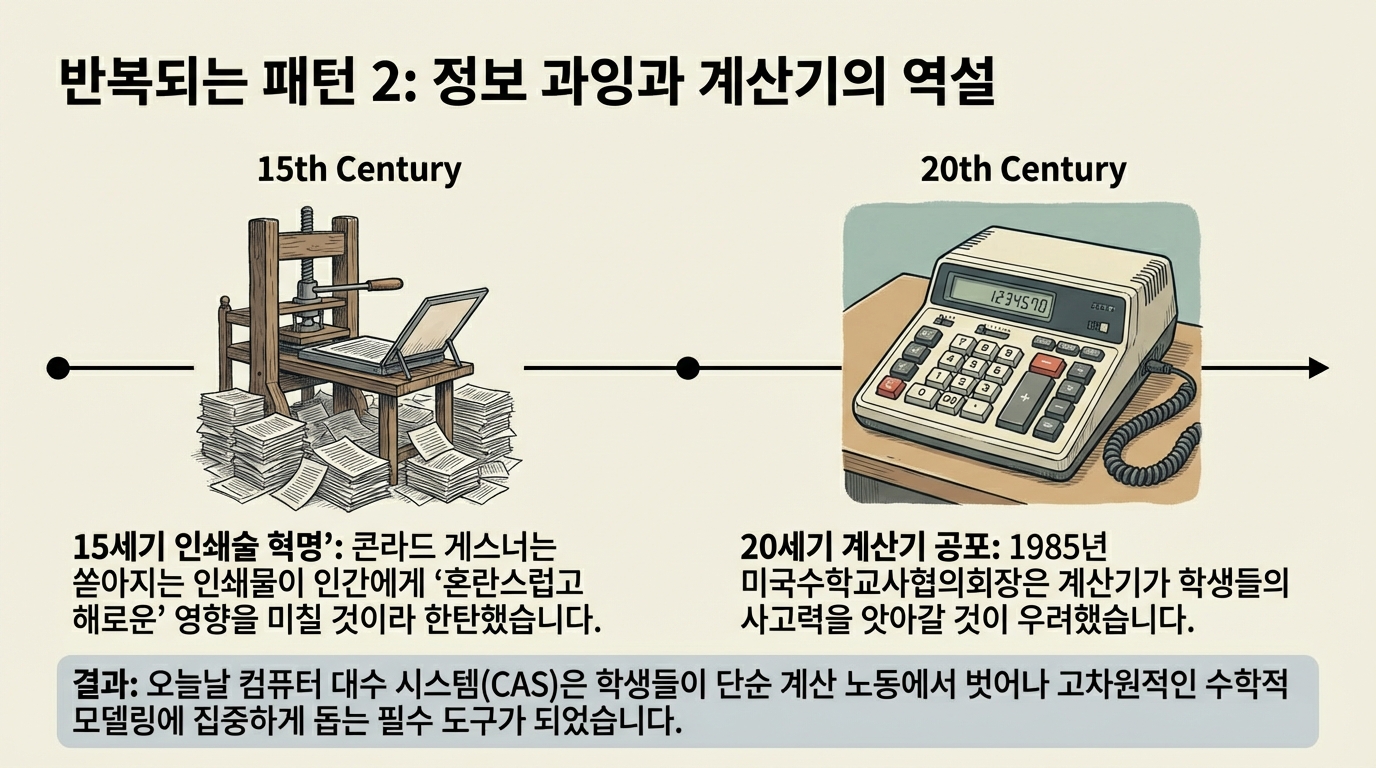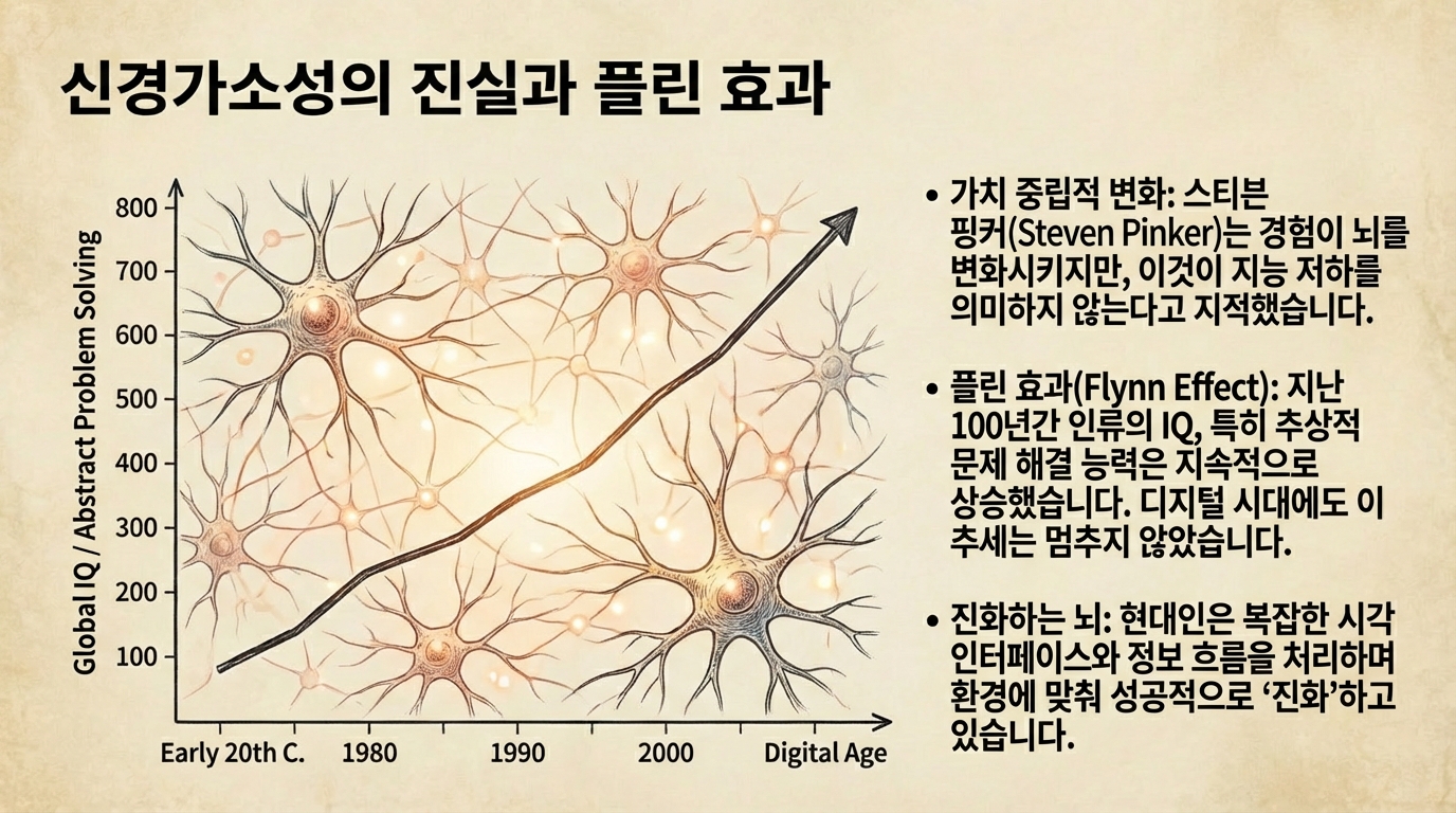 2008년, 미국의 저널리스트이자 기술 비평가인 니콜라스 카(Nicholas Carr)는 『아틀란틱(The Atlantic)』에 기고한 "구글이 우리를 바보로 만들고 있는가?(Is Google Making Us Stupid?)"라는 도발적인 에세이를 통해 전 세계 지식인 사회에 거대한 파장을 일으켰다. 그는 이후 이를 확장한 저서 『생각하지 않는 사람들(The Shallows)』에서 인터넷의 하이퍼텍스트 구조와 산만함이 인간의 뇌를 물리적으로 재배선(rewiring)하여 깊이 있는 사고(deep thinking)와 집중력을 앗아가고 있다고 주장했다. 카의 주장에 따르면, 우리는 정보를 훑어보는 '제트 스키'식 독서에 익숙해진 나머지, 깊은 바닥으로 잠수하여 사색하는 능력을 영구적으로 상실할 위기에 처해 있었다. 당시 스마트폰의 태동과 맞물린 이 경고는 디지털 치매, 문해력 저하 논쟁의 이론적 토대가 되었으며, 기술 결정론적 비관주의의 상징처럼 자리 잡았다. 그로부터 15년이 지난 지금, 인류는 또다시, 그러나 훨씬 더 거대한 기술적 파도 앞에 서 있다. 2022년 말 챗GPT(ChatGPT)의 등장으로 촉발된 생성형 AI(Generative AI) 혁명은 니콜라스 카가 제기했던 우려를 텍스트 검색의 차원을 넘어 지적 노동 전반으로 확산시켰다. 이제 사람들은 검색 엔진이 우리를 바보로 만들까 걱정하는 단계를 지나, AI가 우리의 글쓰기, 코딩, 예술, 나아가 추론 능력까지 대체함으로써 인간을 영구적인 지적 의존 상태로 전락시킬 것이라는 실존적 공포를 느끼고 있다. 카의 논리는 AI 시대를 맞아 더욱 강력한 전염성을 가지고 부활한 듯 보인다. 하지만 현시점에서 냉정하게 데이터를 분석하고 인류의 적응 역사를 되짚어보면, 니콜라스 카의 비관론은 기술 발전의 과도기마다 반복되어 온 '해묵은 공포'의 현대적 변주에 불과하다는 사실이 드러난다. 신경가소성(neuroplasticity)에 대한 최신 이해, 인지 부하(cognitive load) 이론, 그리고 급속도로 진행 중인 인간-AI 협업(Human-AI Collaboration)의 실증적 사례들을 통해, 현재의 AI에 대한 걱정이 기우임을 논증하고, 오히려 인류가 AI라는 인지적 외골격(Cognitive Exoskeleton)을 장착하여 과거에는 불가능했던 지적 도약의 길로 들어섰음을 밝히고자 한다. 니콜라스 카의 주장이 가진 가장 큰 맹점은 기술에 대한 인간의 반응을 역사적 맥락에서 고립시켜 해석했다는 점이다. 사실 새로운 정보 기술이 인간의 지적 능력을 퇴화시킬 것이라는 경고는 2,500년 전부터 끊임없이 반복되어 온 레퍼토리다. 플라톤의 대화편 『파이드로스(Phaedrus)』에서 소크라테스는 문자의 발명을 격렬하게 비판했다. 그는 문자가 사람들로 하여금 기억력에 의존하지 않고 외부의 기록에 의지하게 만듦으로써, 결과적으로 영혼의 '망각'을 초래할 것이라고 경고했다. 소크라테스에게 있어 진정한 지혜는 내면화된 기억과 대화를 통해서만 얻을 수 있는 것이었으며, 기록된 글자는 생명력 없는 그림자에 불과했다. 그러나 역설적이게도 소크라테스의 그 경고조차 제자인 플라톤이 문자로 기록했기에 오늘날 우리에게 전해질 수 있었다. 문자는 인간의 기억 용량을 뇌 밖으로 확장(offloading)시킴으로써, 인류가 단순 암기의 부담에서 벗어나 더 복잡한 철학적, 수학적 사고를 축적하고 발전시킬 수 있는 토대가 되었다. 이러한 패턴은 15세기 구텐베르크의 인쇄술 혁명 당시에도 정확히 재현되었다. 스위스의 생물학자 콘라드 게스너(Conrad Gessner)는 인쇄물로 인한 정보 과잉이 사람들에게 "혼란스럽고 해로운" 영향을 미칠 것이라며, 쏟아지는 책들이 인간의 정신을 산만하게 만들 것이라고 한탄했다. 20세기 중반에는 전자 계산기의 등장이 수학 교육계의 거센 저항에 직면했다. 1985년 미국수학교사협의회(NCTM) 회장이었던 스티븐 윌로비(Stephen Willoughby)는 계산기가 학생들의 사고력을 앗아가고 단순한 문제조차 기계 없이는 풀지 못하게 만들 것이라며 우려를 표했다. 그러나 오늘날 계산기와 컴퓨터 대수 시스템(CAS)은 학생들이 복잡한 계산 과정에 매몰되지 않고 더 고차원적인 수학적 개념과 모델링에 집중할 수 있게 해주는 필수적인 도구로 자리 잡았다. 역사적으로 기술은 언제나 인간의 특정 인지 기능(암기, 필사, 단순 계산)을 도태시켰지만, 이는 지능의 총체적 하락이 아닌 인지 자원의 '재배치'를 의미했다. 니콜라스 카가 우려한 "깊이의 상실"은 사실 정보 처리 방식의 "형식적 변화"일 뿐이며, AI에 대한 현재의 공포 또한 인간이 기계에 지능을 빼앗기는 것이 아니라, 인지적 노동의 성격이 전환되는 과정에서 발생하는 일시적인 마찰음으로 해석해야 한다. 니콜라스 카는 신경가소성(neuroplasticity)을 근거로 인터넷이 뇌를 얕고 산만하게 만든다고 주장했지만, 신경가소성 자체는 가치 중립적인 메커니즘이다. 하버드 대학의 심리학자 스티븐 핑커(Steven Pinker)가 지적했듯, 경험은 뇌를 변화시키지만, 이것이 곧장 지능의 저하를 의미하지는 않는다. 오히려 디지털 환경은 새로운 형태의 인지 능력을 발달시켰다. 검색과 하이퍼링크를 통한 정보 탐색은 방대한 데이터 속에서 패턴을 발견하고 연결하는 능력을 강화했다. 이는 '플린 효과(Flynn Effect)'—지난 100년간 인류의 지능지수(IQ), 특히 추상적 문제 